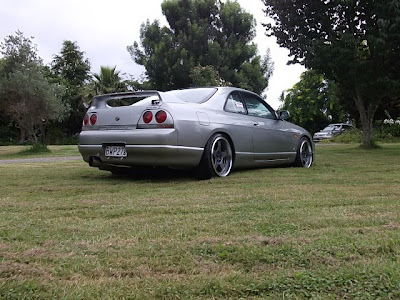 Troy's R33, rb25det, half cage, coilovers and 17x9s.